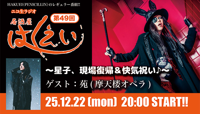 12月22日(月)20時より、HAKUEI(PENICILLIN)のニコ生ラジオトーク番組「居酒屋はくえい」<第49回>がスタート!