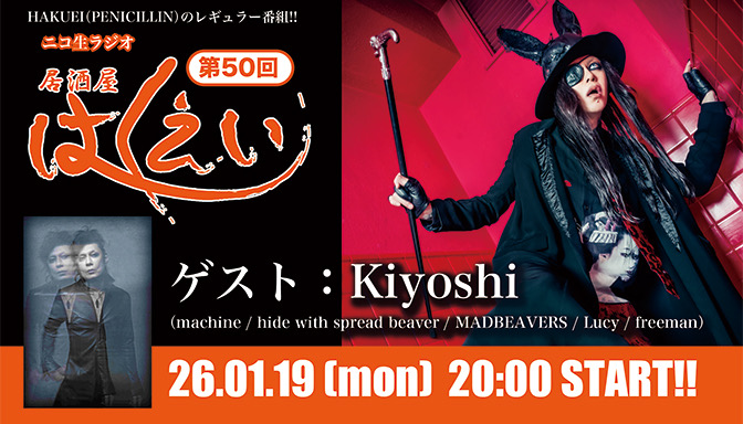 本日20時配信予定 ニコ生ラジオ放送「居酒屋はくえい」(ゲスト:Kiyoshi)の番組内容変更のお知らせ